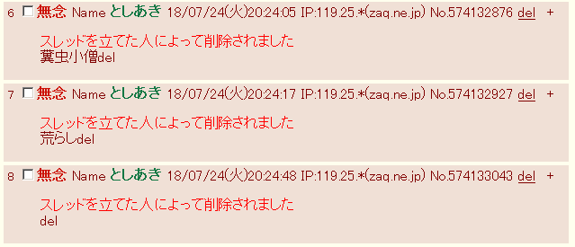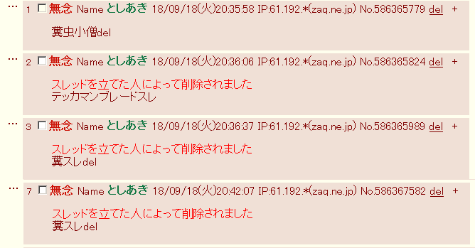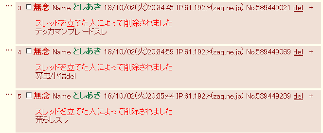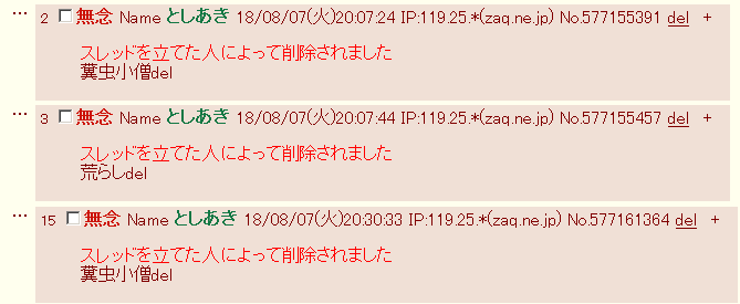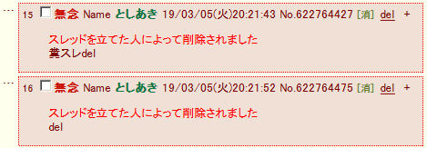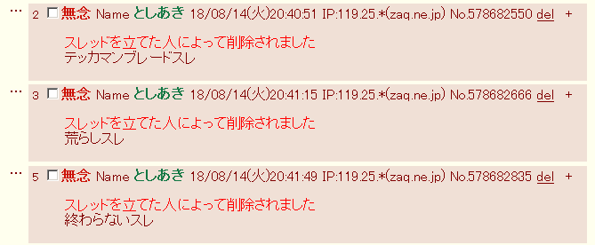 (スレを立てた人間でも自分の書き込みを消すと「書き込み~」と表示される