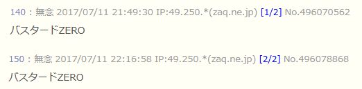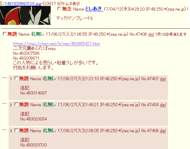 ふたばちゃんねるのとある定時スレ(なりきりスレ)に年単位で粘着していた「zaq.ne.jp」と、