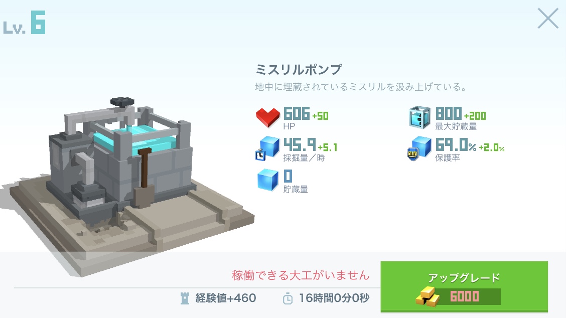 | Lv | HP | 最大貯蔵量 | 採掘量/時 | 保護率(%) | 費用(G) | LvUP時間 | 獲得Exp | |