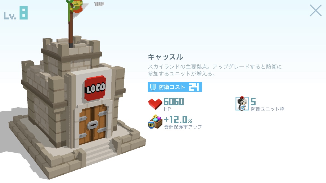 | Lv | 画像 | HP | 防衛cost | 防衛unit枠 | 資源保護率UP | 費用 | LvUP時間 | 獲得Exp | |