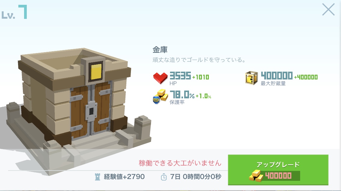 | レベル | HP | 最大貯蔵量 | 保有率 | 費用(ゴールド) | レベルアップ時間 |