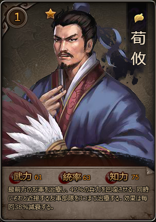 毎ラウンド開戦前、最も兵力損失の大きい味方部隊1体の兵力を回復し(回復值=荀攸現存兵力30%)、回復目標兵力の兵力が35%より低い場合、さらに25%の兵力を回復する。 - 発動効果: