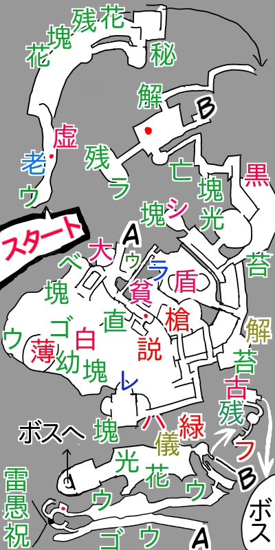 ☞仕掛け、罠 ・解呪の碑に行くには地図上 A 近くのショトカを開け人間性に変身するまで任意のアイテムで変身し 左の壁沿いにショトカで開けて中を進むと梯子が現れる ・A から進んだ螺旋階段は右に進んで降りた後左の壁沿いに上がって行けば進める ・黒い竜のブレスの避け方 1回目:右の穴 2回目:左の段差に避けて竜の足元で切り刻む | 웃商人 ・ラップ ・フィリアノール ・老人 | |||||