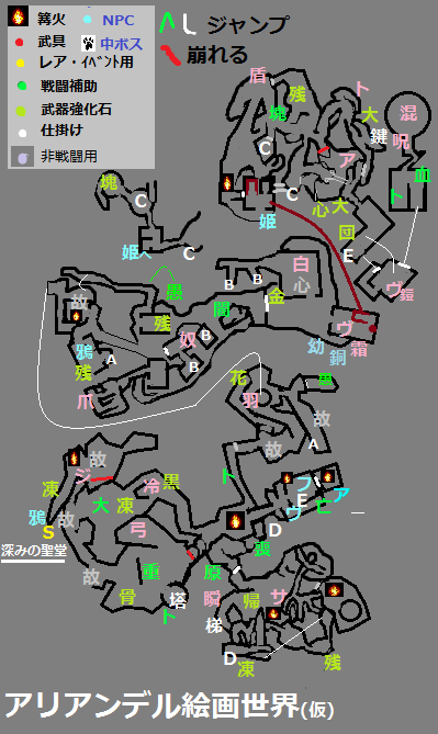 ⇔繋がっているエリア深みの聖堂 ・DLC第1弾「ASHES OF ARIANDEL」を導入した後、 深みの聖堂の篝火「清拭の小教会」のそばにいるNPCに話しかけるとアリアンデル絵画世界へ移動する。 エリアの難易度は高いので、ロスリック城をクリアできるくらいのレベルが推奨。 ・不死闘技・橋下への行きかたはこちら ![]() ・大蠅が大量に居る水場(ヴ鎧)の所には、2つ幻影の壁がある 地図&アイテム 400x400 | 【篝火】 ┣雪原 ┣吊橋を臨む洞 ┣鴉村 ┣雪の山道 ┣アリアンデルの礼拝堂 ┣絵画の底 ┗王者の墓守 | |||||