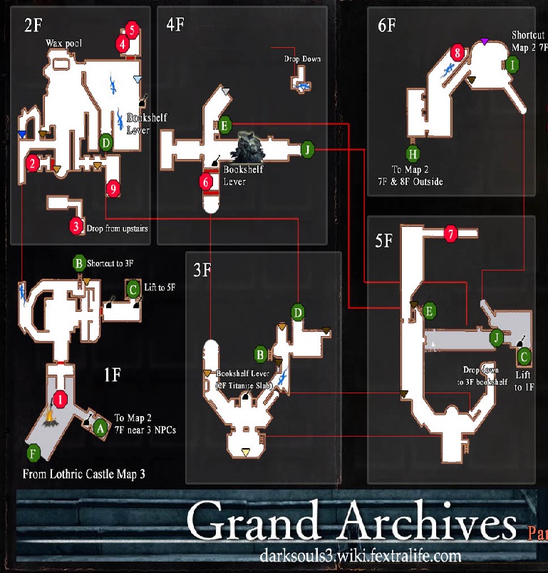 | ☞仕掛け、罠 ・ロウに頭を付ける 白い手による呪いを受けなくなる (有効時間があるので点在する溜めロウを使おう) ・最初の白い手の部屋内レバー 【ショートカット1】↑から入り口まで 【ショートカット2】最上階から入り口まで 【ショートカット3】屋上から最上階(【ショートカット2】)まで 【ショートカット4】屋上から篝火まで ・罠 | 웃商人 ・ ・ ・人 | |||||