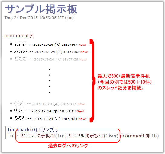 - コメントページ(サンプル掲示板)では、最大で500+pcommentの最新表示件数(今回の例では10)のスレッド数が掲載されます。