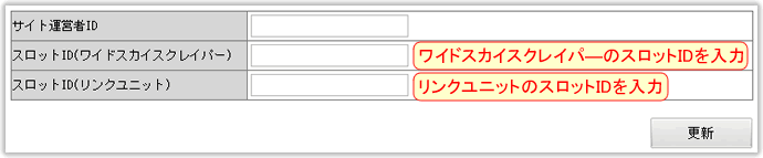 3.スロットID(ワイドスカイスクレイパー)またはスロットID(リンクユニット)のどちらかに、事前に作成済みのアドセンスコードに「google_ad_slot」として記載される10桁の数字を入力してください。