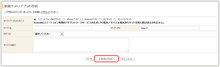 ※既にサイトを登録済みの場合は、新たにサイトを登録する必要はございません。直接広告枠の作成を行ってください。 - 必要な項目を入力したら「広告枠の作成へ」をクリックします。