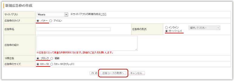 広告のタイプは「バナー」、広告枠の形式は「オーバーレイ」、18禁広告は「ブロック」、広告枠のサイズは「320x50」を指定してください。