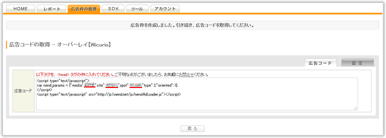 - 表示された広告コードのmedia、site、spotの値をWicurio管理画面の「Nend