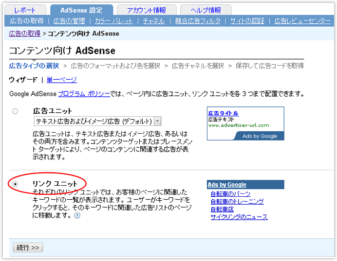 - 「広告タイプの選択」ではリンクユニットを選択します。