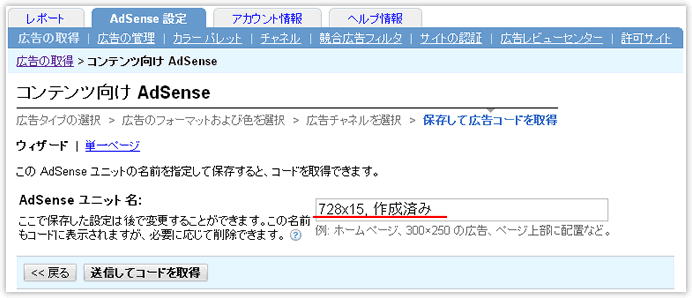 - 「保存して広告コードを取得」では、今回作成した広告ユニットにわかりやすい名前を付けて保存します。