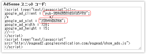 - 保存後に表示されたコードの「google_ad_client」の後ろに表示されている値がサイト運営者ID。