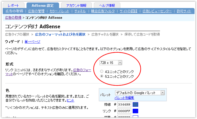 - 「広告のフォーマットおよび色を選択」画面の形式で728×15と5ユニットごとのリンクを選択します。