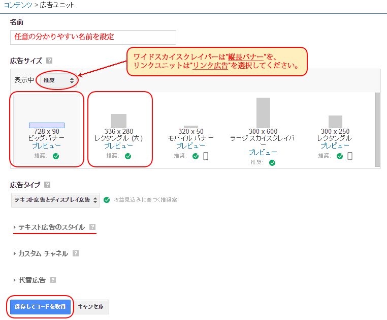 ワイドスカイスクレイパーやリンクユニットを作成する場合は「推奨」となっている部分をクリックし、「縦長バナー」または「リンク広告」を選択すると、広告サイズを指定できます。