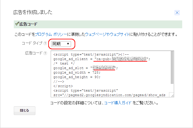 - 保存後に表示されたコードでは「コードタイプ」を同期に変更し、「google_ad_client」の後ろに表示されている値がサイト運営者ID、