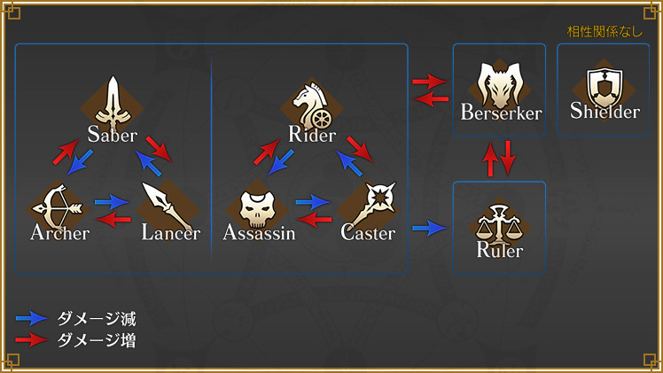 FGOアーケードにおいては、クラスごとの相性が存在し被ダメ・与ダメが変化する他、クラスごとに以下のパラメーターが異なります。