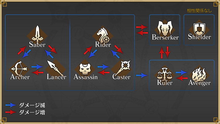 FGOアーケードにおいては、クラスごとの相性が存在し被ダメ・与ダメが変化する他、クラスごとに以下のパラメーターが異なります。