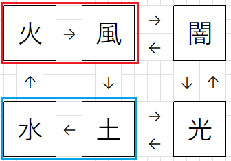 4属性は 火>水>土>風>火 光闇は互いに反対属性が攻撃有利