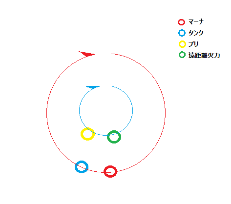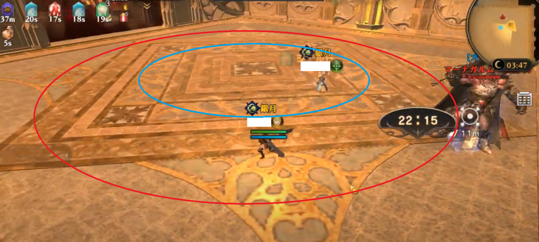 絶憎双顎は被弾数?が多い一番中央の濃い円から出た場所に集まってシールドをもらう 中央の円の中でもシールドで防げるが事故を防ぐためにも出た位置に集まるほうが良いのではないかと思う 3種の全てにバフ除去があるようなのでプリは白いエフェクトが出た後にシールドを貼る必要がある 武 立ち位置パラが赤ラインに沿うように回り、他のメンバーは青ラインに沿うようにまとまってマーナの横を取って殴る 床の模様で立ち位置を確認すると良い 追従するように動いていると範囲攻撃の際も集まりやすい プリは常にタンクのすぐ内側を追従するように回る(タンクとの距離15m前後) 範囲攻撃(狼爪撃、他)に巻き込まれる可能性があるので、タンクが外にぶれてもあまり外まで追いかけず戻ってくるのを待つ 遠距離攻撃職は壁を出した際に射線を通しやすいプリの少し後ろを回る 広範囲攻撃(猛狼戦咆、他)の際は遠距離攻撃職は少し前に出るだけ、タンクは少し内側に寄るだけでシールド範囲内に集まれる プリパラ防 立ち回り武より攻撃力は控えめなので後半使ってくる3連撃以外は70スキルで盛らなくてもHPで受けられる 2匹同時だが正面ど真ん中から近寄らなければ片方だけ釣ることが可能なので1匹ずつ壁際に釣って狩る マーナがアクティブになると壁が出現するので、壁が出現したら即壁際まで後退すると片方だけ釣れる タンクも70スキルは攻撃力に盛るほうが殲滅は早いが装備が十分でない場合はHPを盛ったほうが安定性は高い |