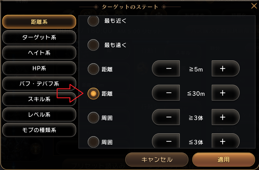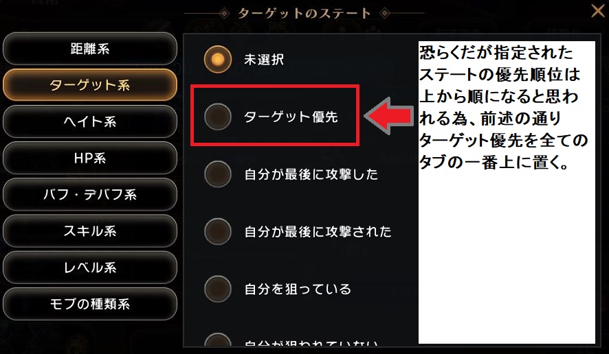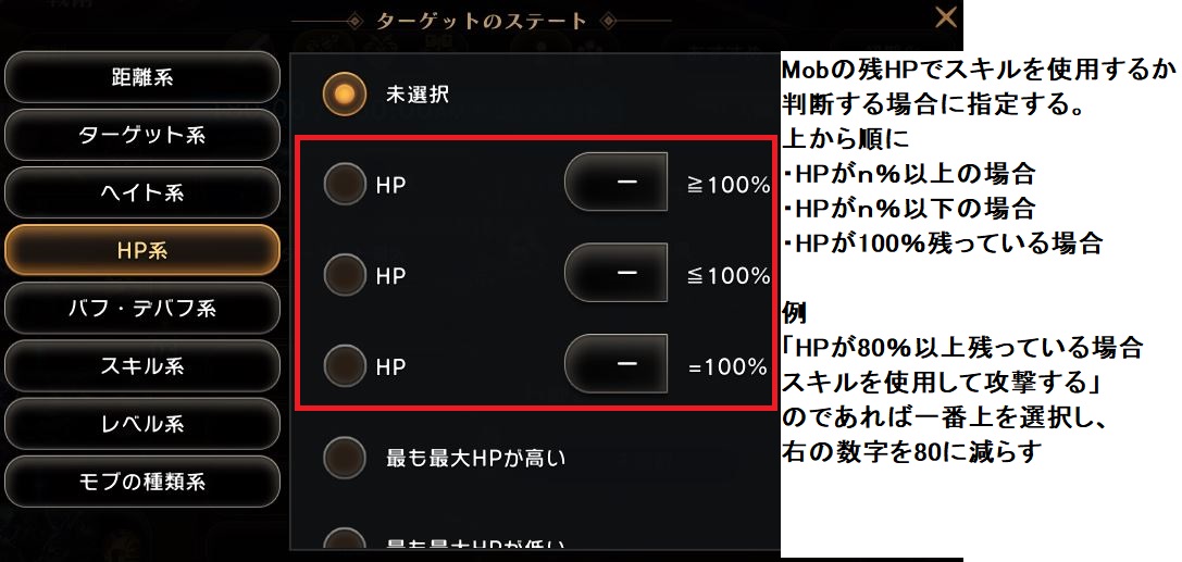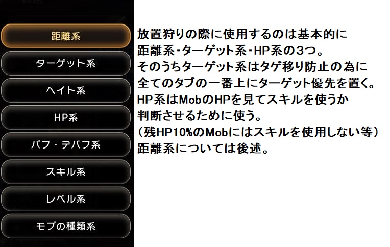 1. 例15m以下の距離にいる敵に対してHPが満タンだった場合「槌投げ」を使用する ターゲット優先が一番上に指定されているので倒せなかった場合もターゲットしているMobを殴る 画像の場合、ターゲットのHP100%でないとスキルを使用しないので、HP=100%以外の二つが基本になる ターゲット優先の指定をしなかった場合、近距離攻撃主体であれば問題ないが、遠距離攻撃主体だった場合、 ターゲットより近くにMobがPOPするとそっちに流れる場合がある 2. 敵へのステートの種類3. ターゲット系4. HP系5. 距離系 |