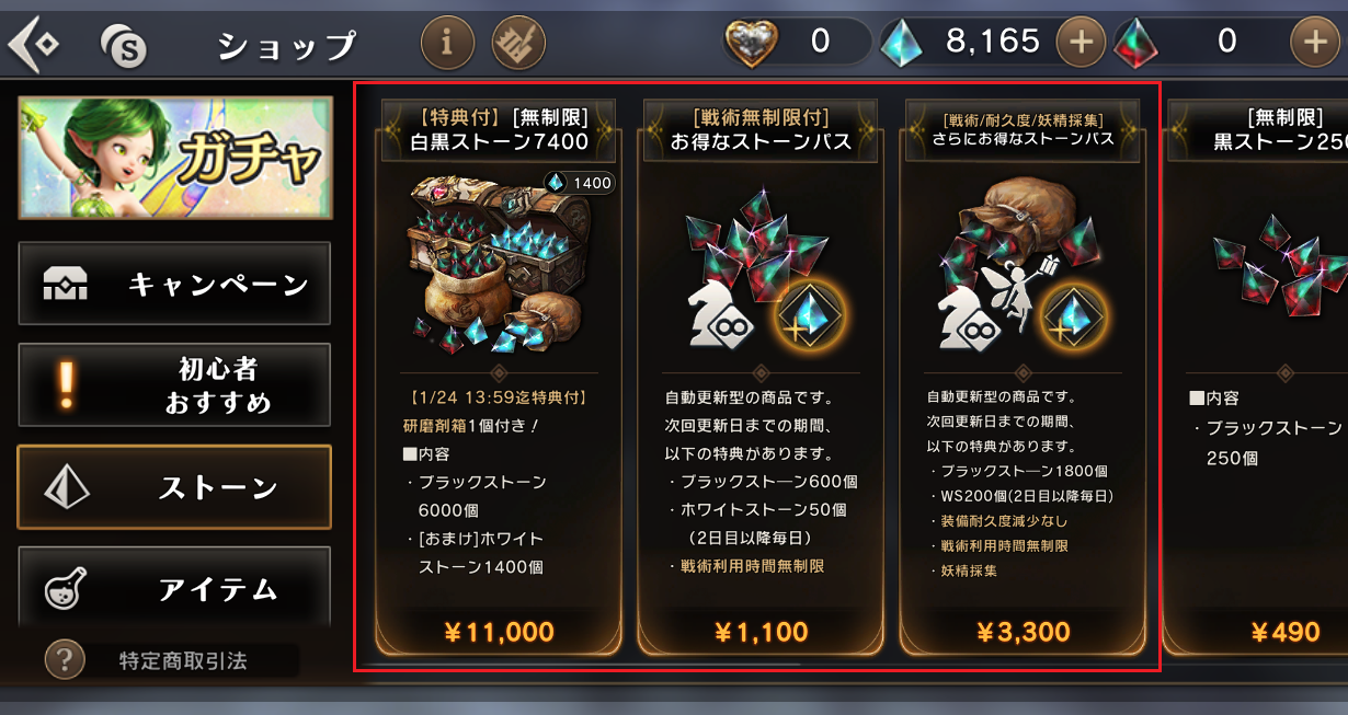 ショップ内のストーンのカテゴリにある2種のストーンパスに戦術無制限が付いている