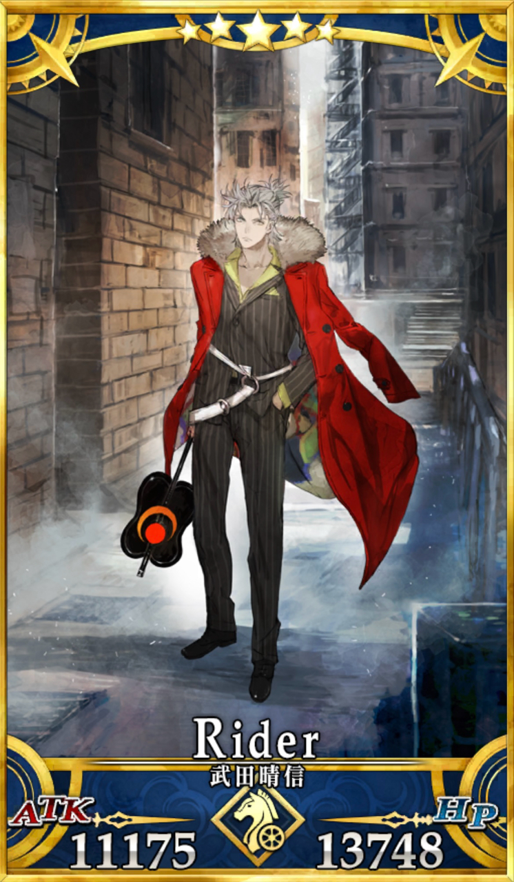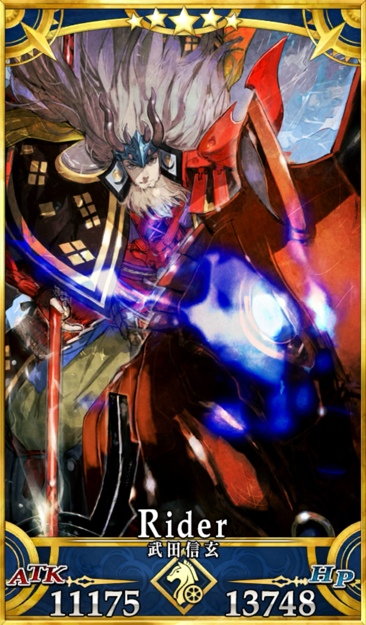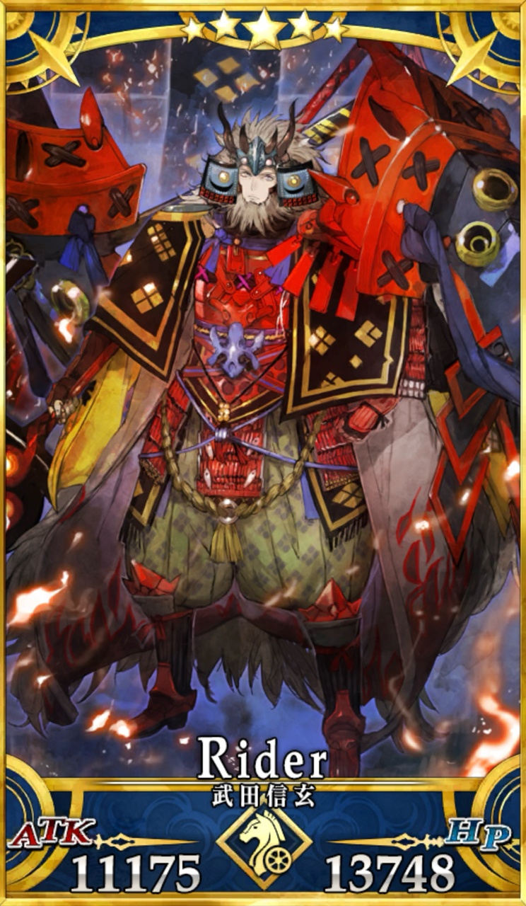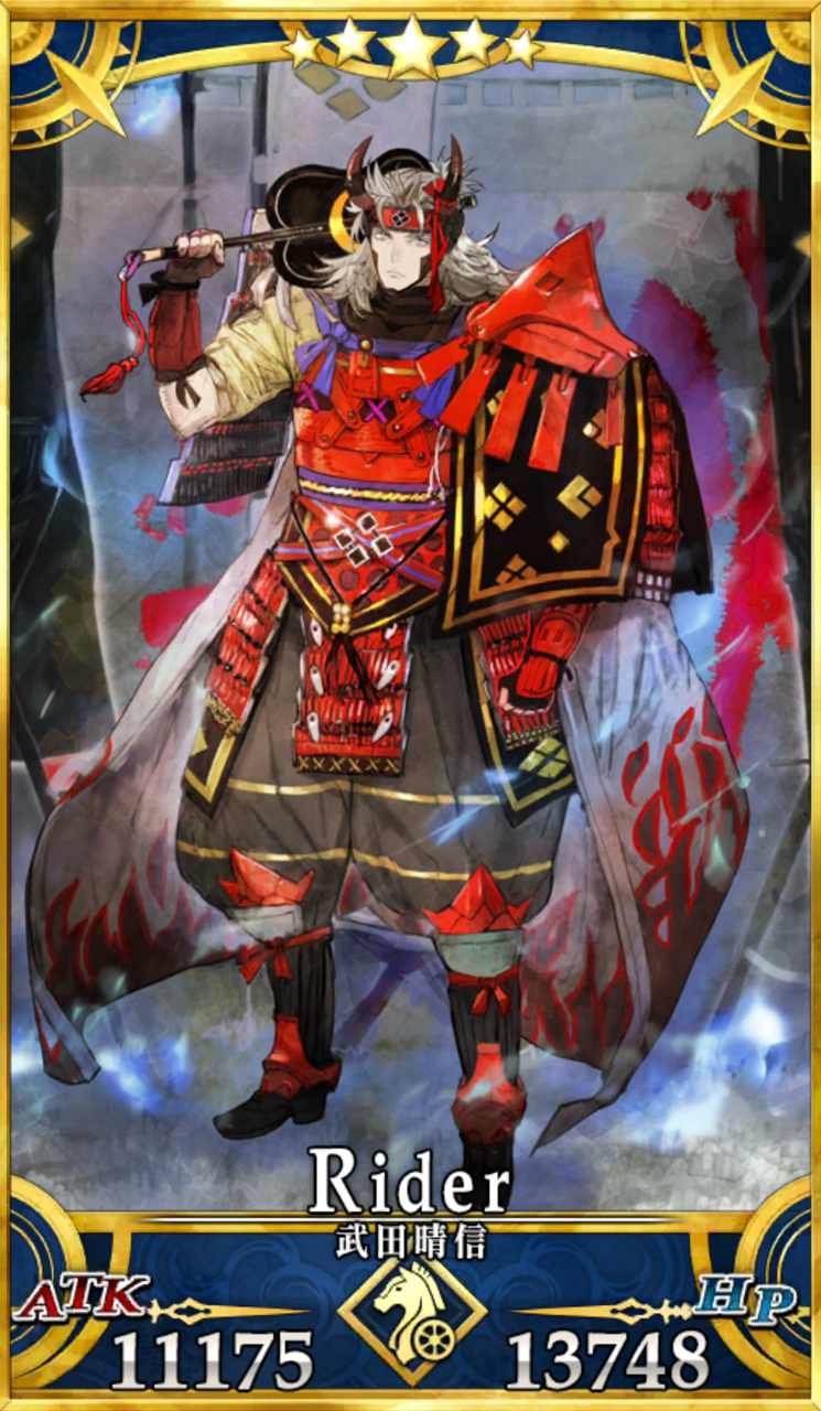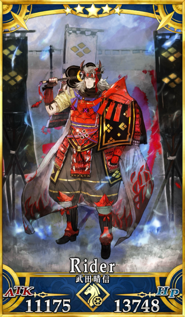 甲斐の赤備え 。ライダークラスでは初。- Hit数は全て4Hit(EXのみ5Hit)と多く、1枚のみの分Arts性能は高めとなっている。