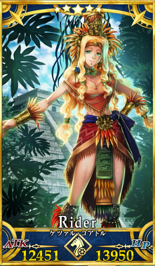 No. 名前 Lv.M HP ATK 筋力 耐久 敏捷 魔力 幸運 宝具 Q A B 保有スキル 144 ケツァル・コアトル 90 12960 12001 B B B+ EX A+ EX 1 2 2 カリスマ[A+]