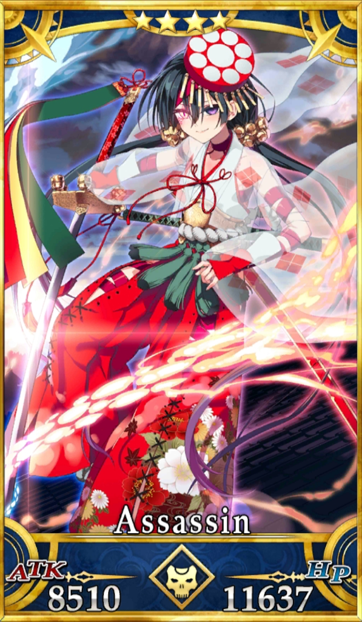 難点は☆4アサシンとしてはスター回収力がやや劣る点。Qは3ヒット&気配遮断もA+なのでそこそこに稼ぐことは出来るが、流石にQuickブレイブチェインができるアサシンには及ばない。- メインアタッカーとして使う場合は「おろちの呪」とArtsチェインからの宝具でじわりじわりと削り倒すことになる。