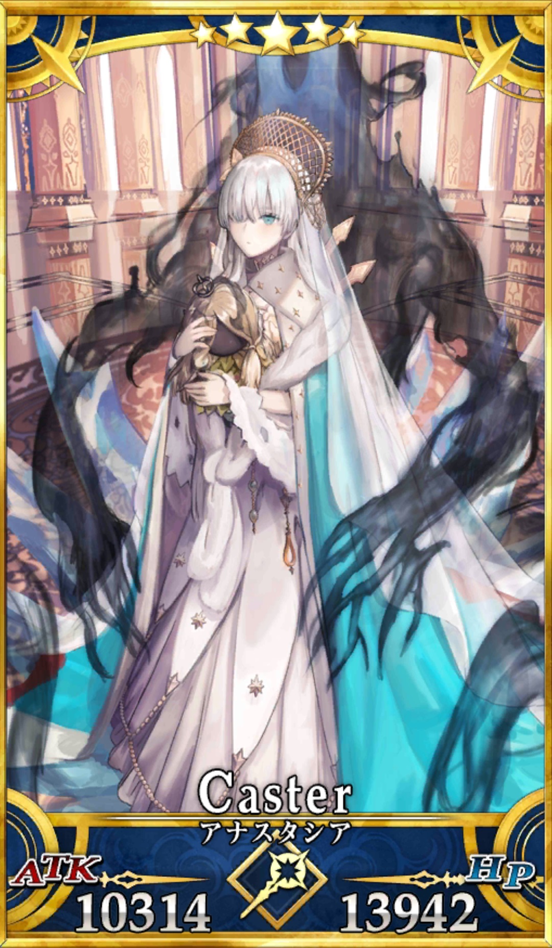 - ☆5キャスター。2018年4月4日に「永久凍土帝国アナスタシア」実装に伴い、恒常枠のサーヴァントとして実装。