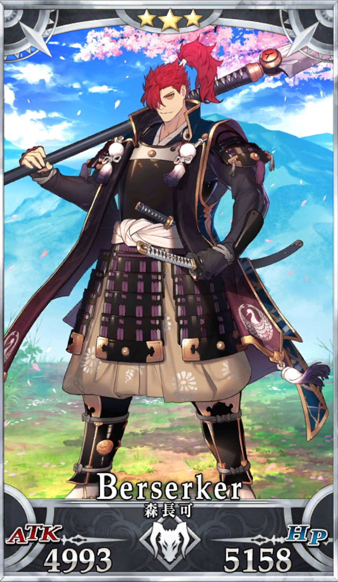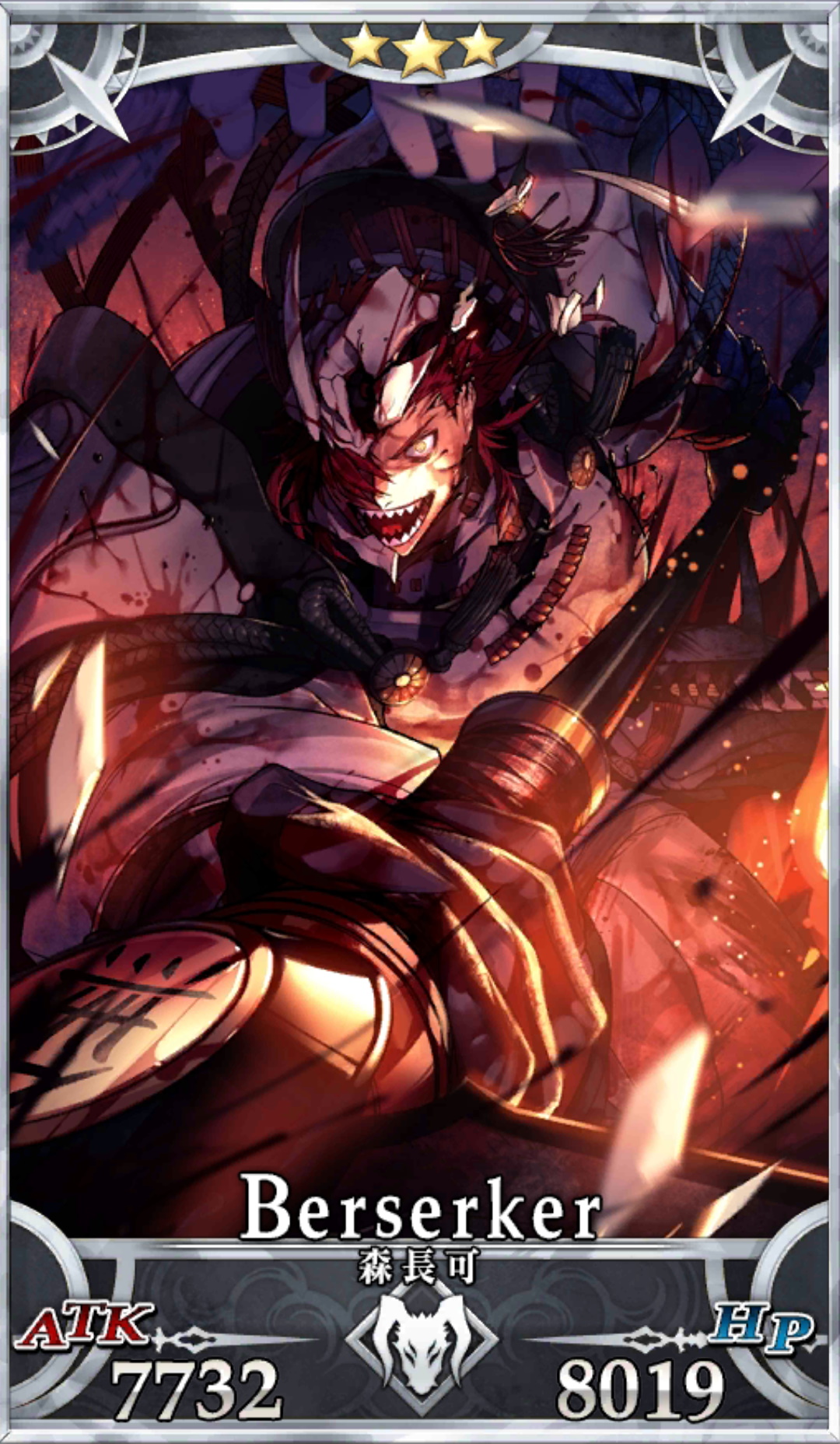 | 森長可 | 8302 | 7732 | 1 | 2 | 2 | B/単 | 精神汚染(兇)[B] | 血濡れの蛮勇[A+] | 鬼武蔵の遺言状[C] |