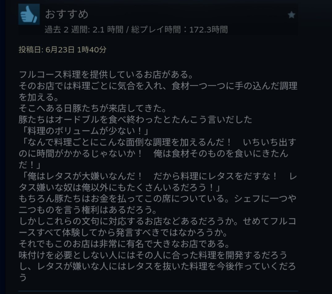 もちろん豚たちはお金を払ってこの席についている。シェフに一つや二つものを言う権利はあるだろう。
