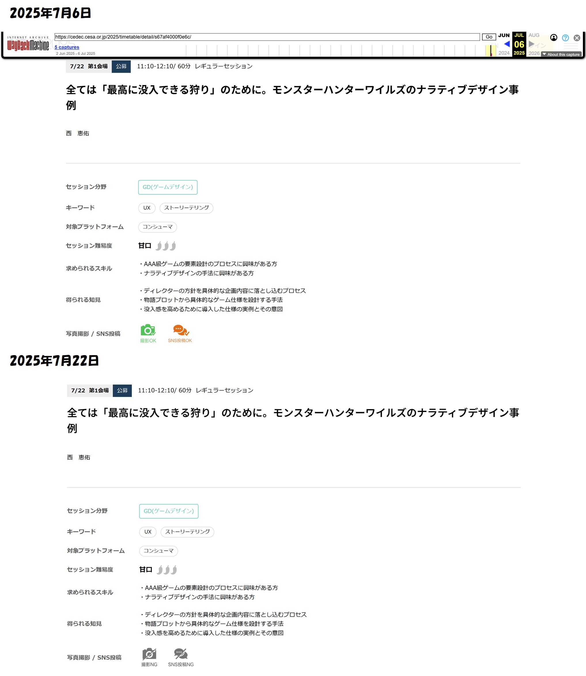 当日になりカプコン関連の講演が撮影・SNS投稿NGに変わっている事が判明。