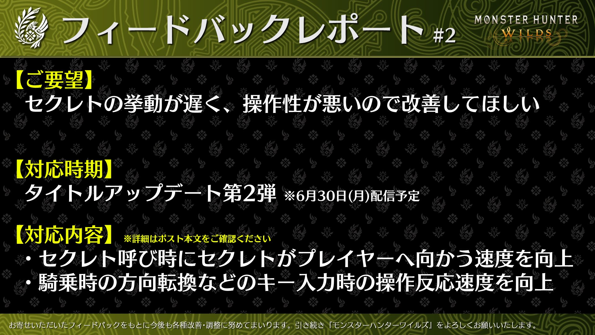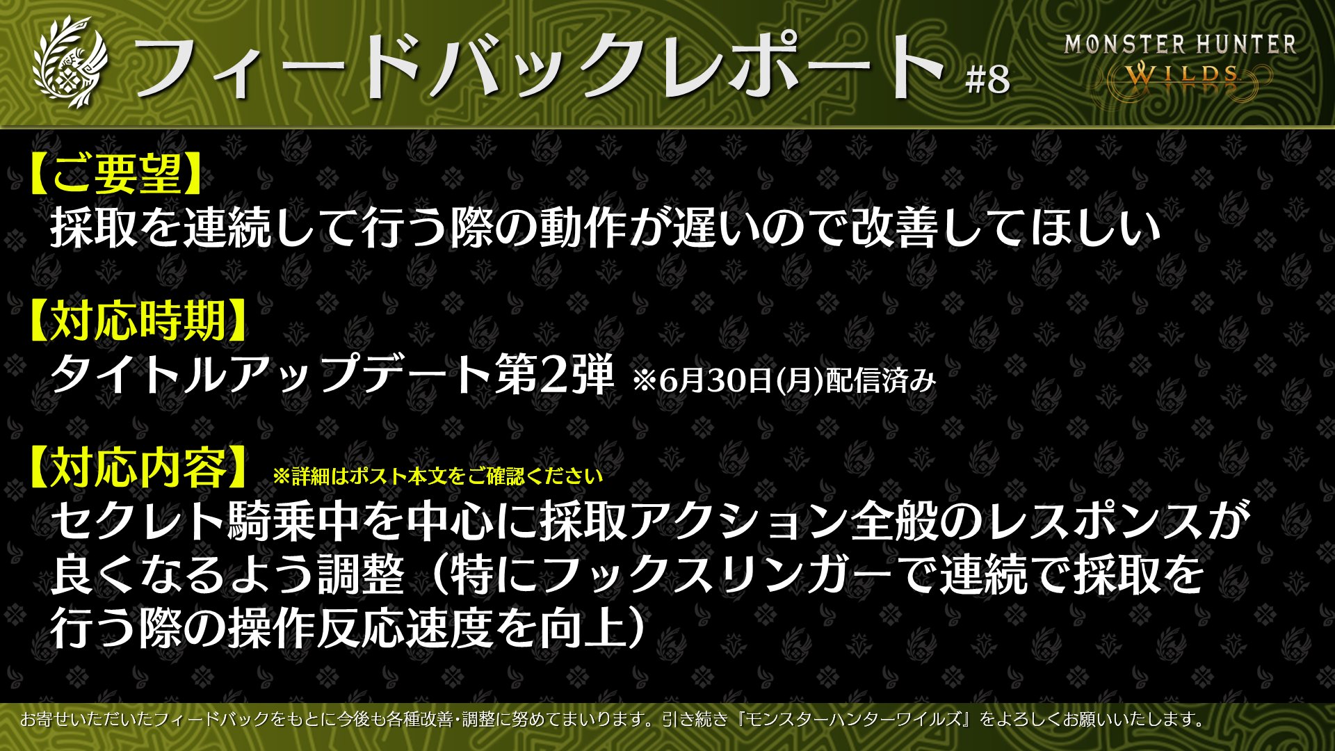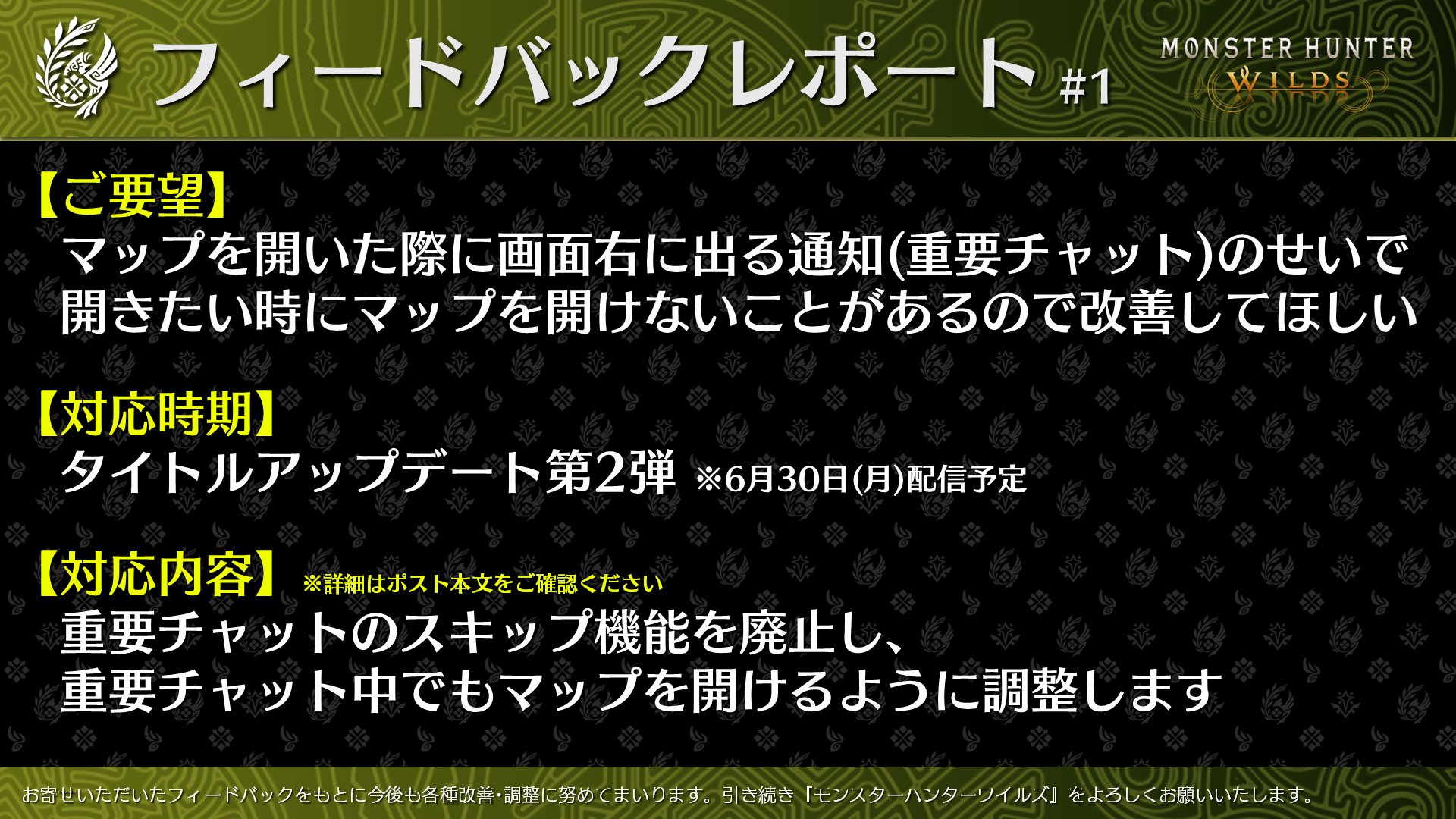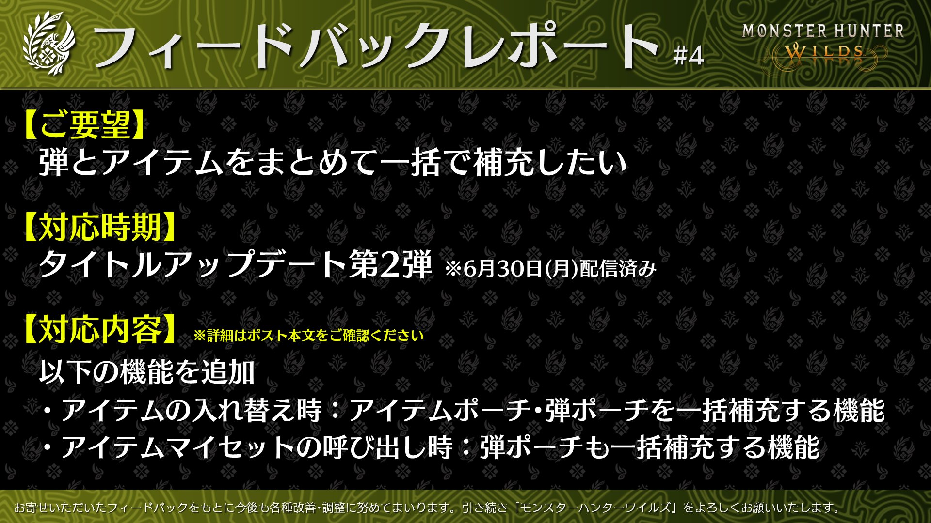ユーザーの皆様からのフィードバックをもとに、より快適で楽しいゲーム体験をお届けできるよう、引き続き全力で取り組んでまいりますので、今後とも『モンスターハンターワイルズ』を何卒よろしくお願いいたします。#モンハンワイルズ #MHWilds