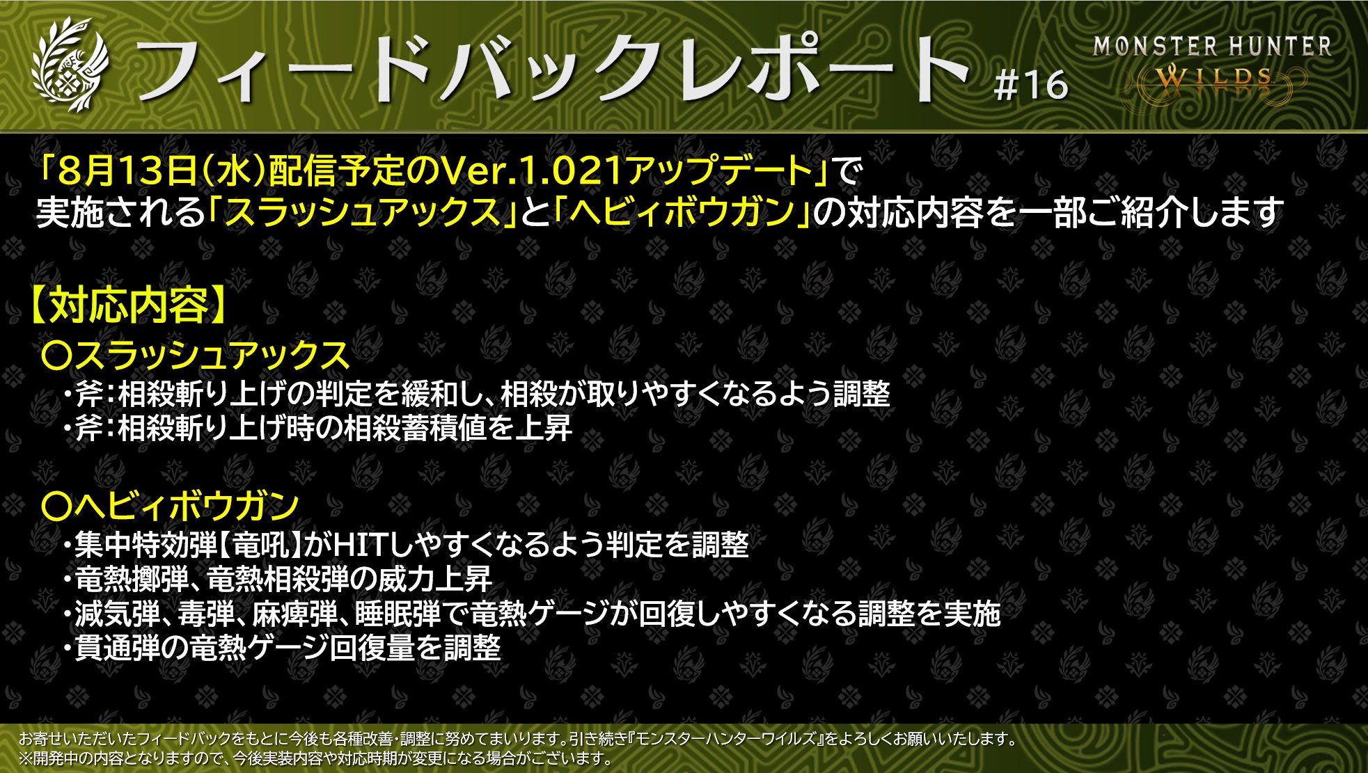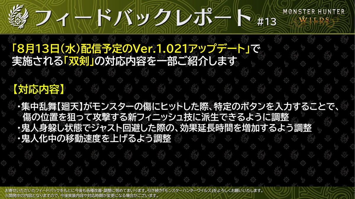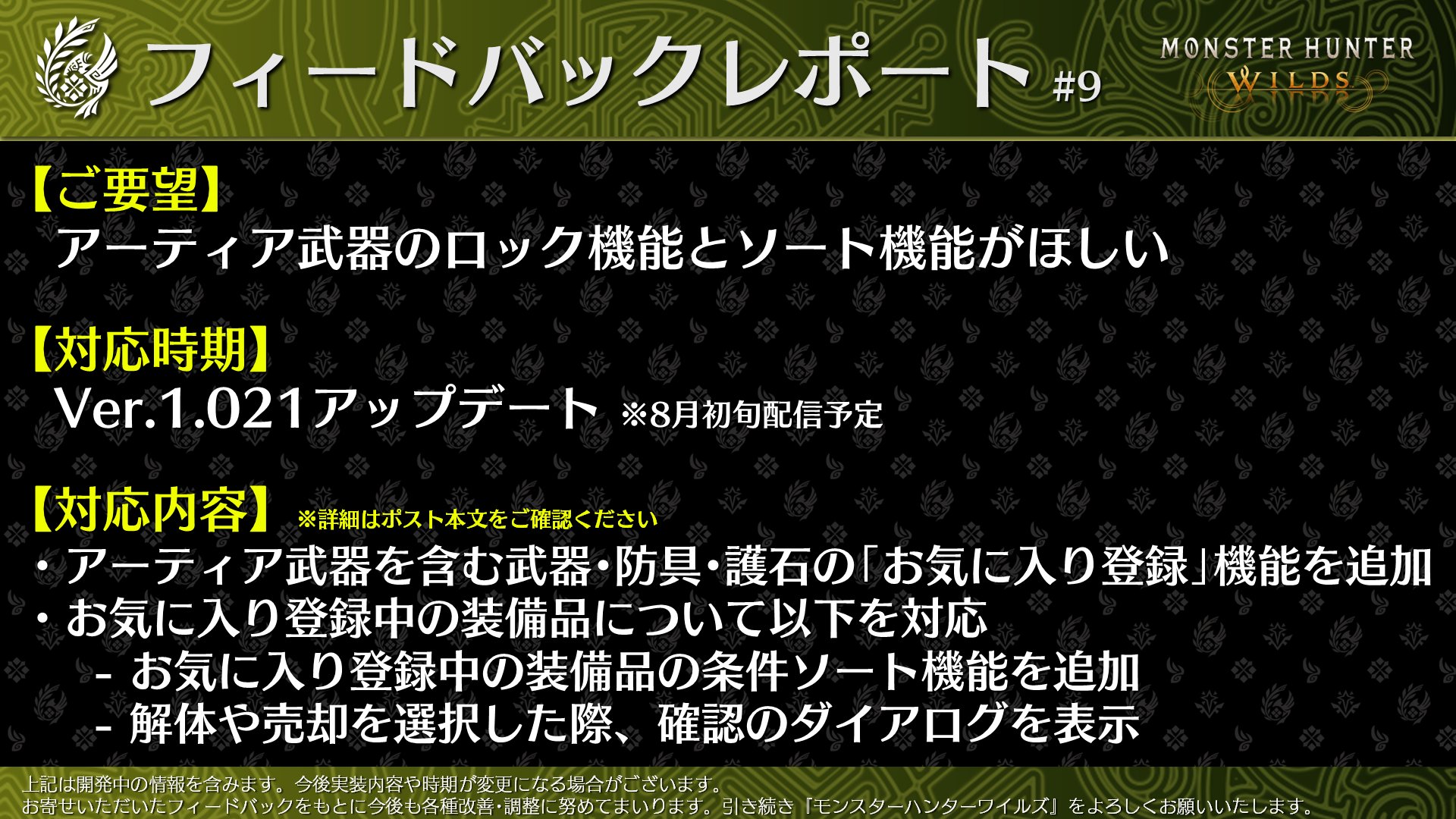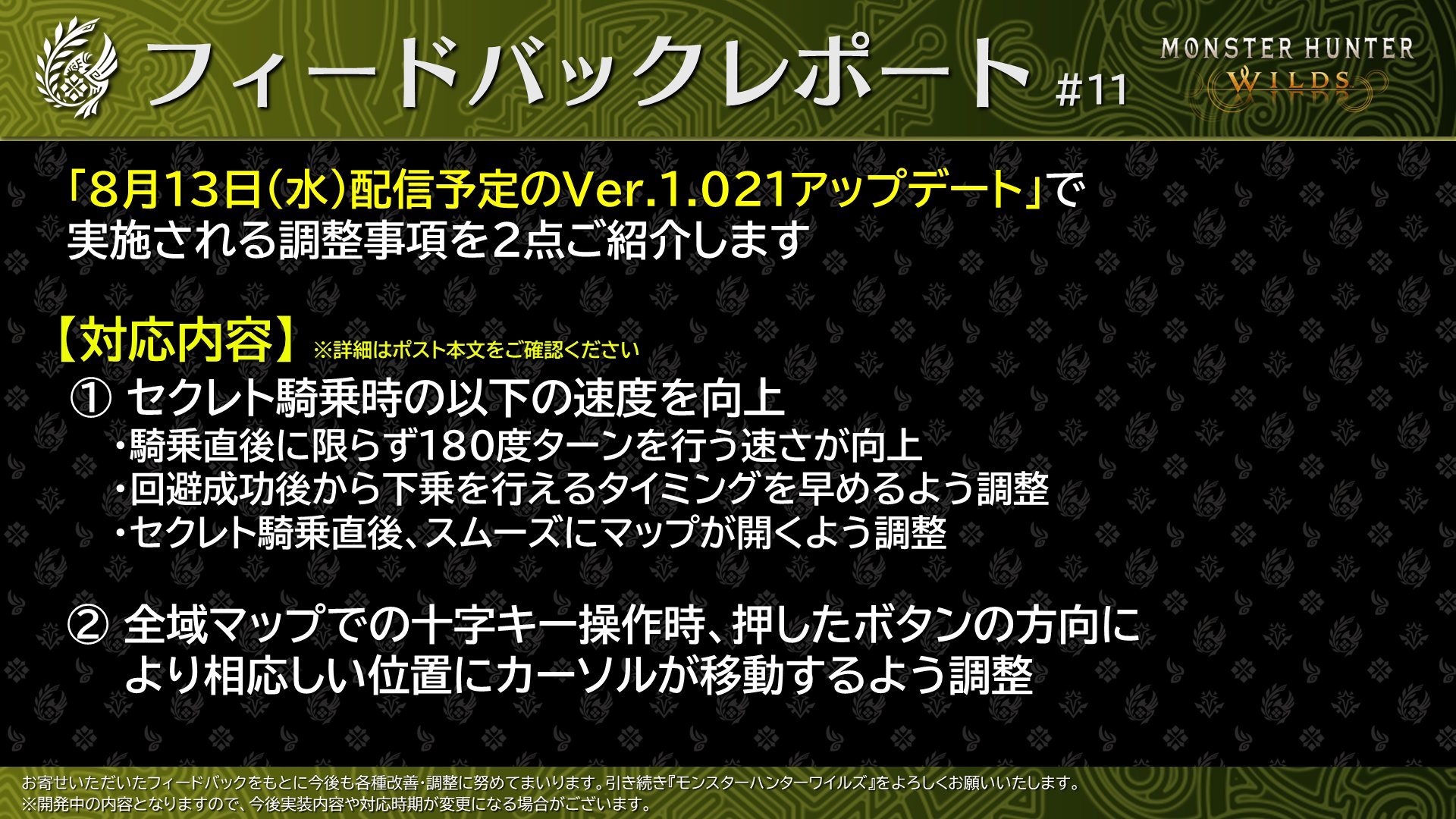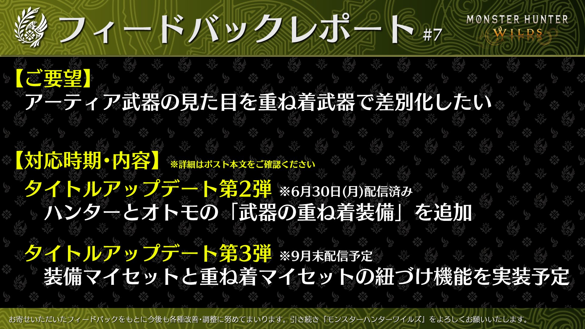ユーザーの皆様からのフィードバックをもとに、より快適で楽しいゲーム体験をお届けできるよう、引き続き全力で取り組んでまいりますので、今後とも『モンスターハンターワイルズ』を何卒よろしくお願いいたします。#モンハンワイルズ #MHWilds