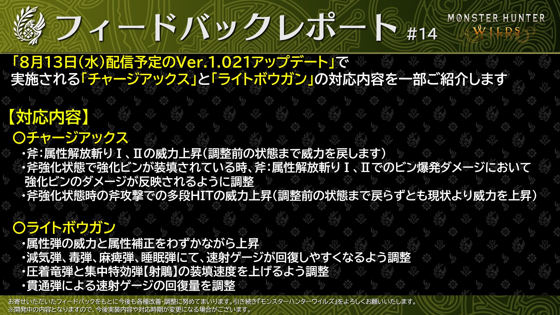#14![]() | 08月12日 | 対応予定 | Ver.1.021のチャージアックスとライトボウガンの調整内容 |