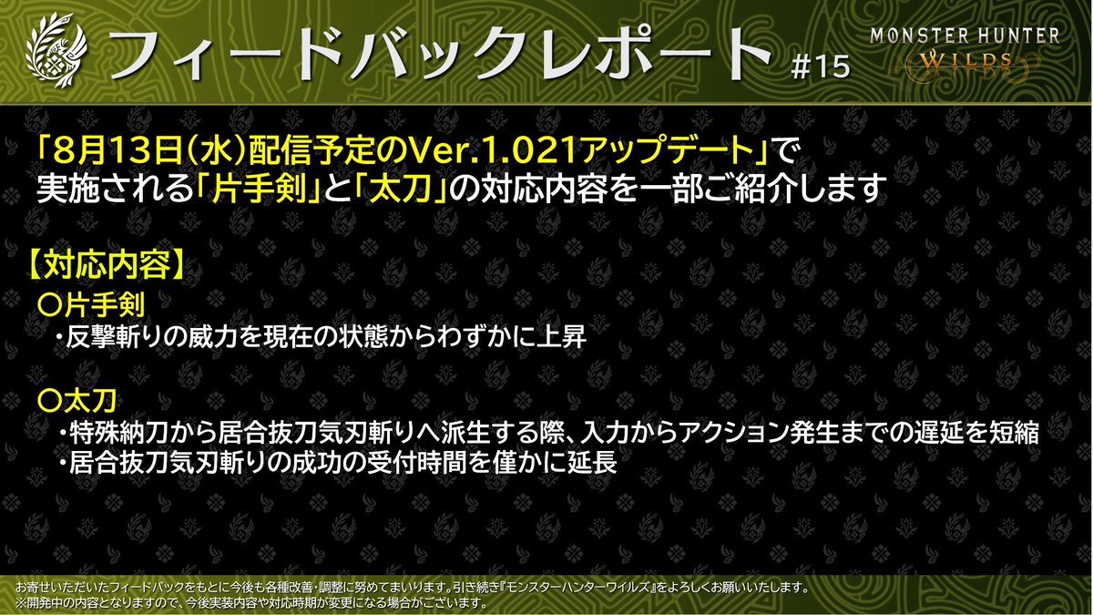#15![]() | 08月12日 | 対応予定 | Ver.1.021の片手剣と太刀の調整内容 |