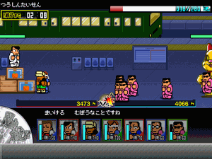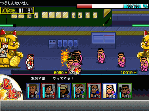 初期キャラくにおがレアで結構強いので、他のレアキャラ出るまでは、どうしてもこれになりがち。くにおをLv20(覚醒)までさせると、それ以下のキャラしか持ってない人には大変脅威。勝てない。