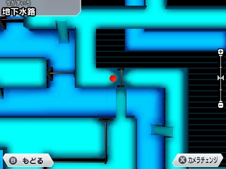 マップ左上に通路が3本あり、左側:水門の開閉スイッチ、中央:水路の柵の開閉スイッチ、右側:水門の開閉スイッチがある。