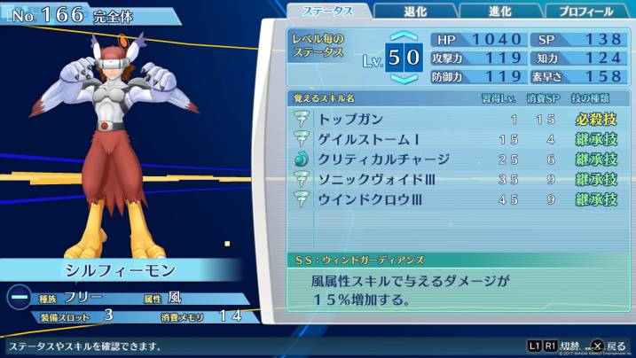 | スレイヤードラモン | 必殺技には乗らないが、サブウェポンとして採用されるウィンドクロウに補正が乗る。素早さもSSで10%アップする。 |