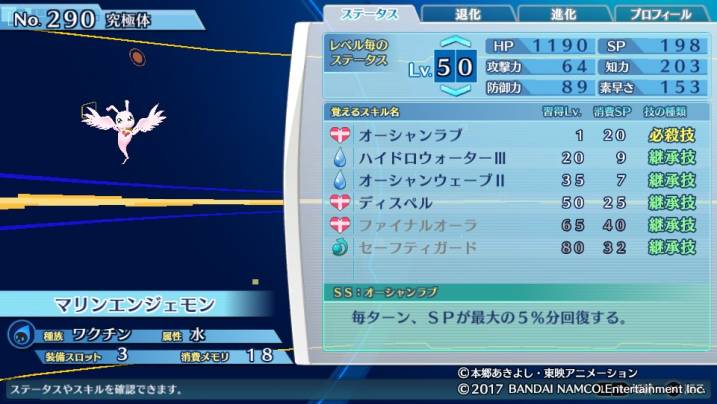 マリンエンジェモンと同じ効果だが、全デジモン中ナンバー1のSPを誇るあちらと比べると半分以上も下回っている。