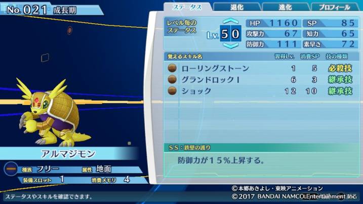 ちなみにステータスを比べるとHP、SP、素早さはアルマジモンの方が上。