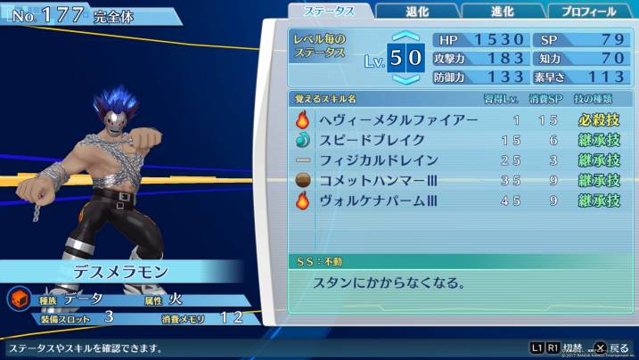 究極体クラスの攻撃力に高いHPとそこそこの防御。半面SPと知力は低い典型的な物理アタッカー。