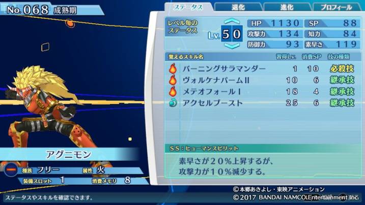 ステータスとしてはアグニモンをより攻撃的にした、と言えば聞こえが良いが当然SSでアグニモンとの差別点である攻撃力が下がっている。