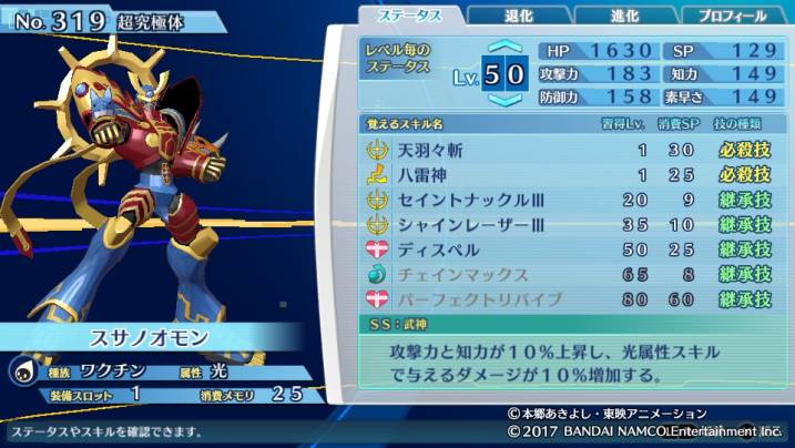 | スレイプモン | 『神秘の護り』で状態異常の耐性がアップ。ビフロストは『武神』の補正を受ける。 |