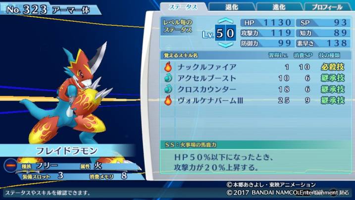 カスタマイズ性に関しては成熟期以下としては随一であり、後述のSSも考慮すると物理主体のパーティならフーディエモンを差し置いて採用する価値がある。