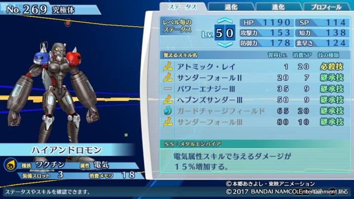 | ケルビモン(悪) | SSでライトニングスピアのダメージを増加。自分のSPの低さを『イービルハート』で補ってもらう。 |