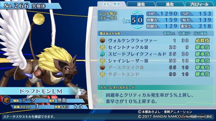 | 知力+150 | 一見ただの変態型だが、3つあるスロットを使い特化すれば実数値で378となり並の知力型デジモンを超える。機動力は素早さ無振りでもある。 |