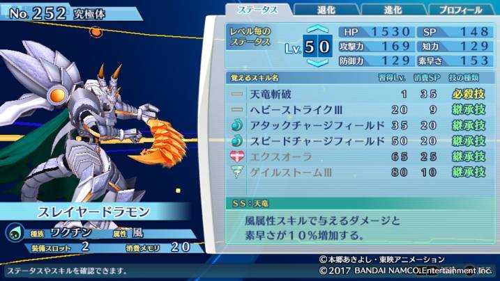 素の素早さも何気に負けてはいるが、こちらはSS『天竜』の効果込みでスレイヤードラモンが勝利している。