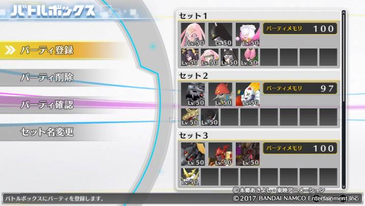 最大で6パーティまで登録可能、対戦においては手持ちのパーティ+バトルボックスの6パーティから使用するパーティを選択できます。